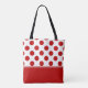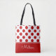 This personalized bag features a red polka-dot pattern over a white background. A matching section at the bottom has a template area for you to personalize it with a name or other custom text. Click "Customize It" to change the size of the dots.