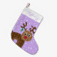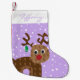 Personalized Reindeer Small Christmas Stocking. Cute Christmas reindeer with red nose and a green ornament hanging from his antlers. Light purple background. Personalize with their name in pretty scripted font.
