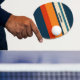 This personalized ping pong paddle features a retro colour palette with a cool trendy font.