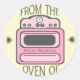 A cute yet functional sticker featuring a retro stove in pink outlined in grey over an off white background. Grey text above and below reads "From The Oven Of." Personalize with your name on the stove. Grey hearts on each side.