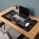 Bring the techno beauty of this steampunk factory, consoles, workbenches into your workspace with this exquisite desk mat. Personalize it with a name printed on the lower right corner. This mat features a view of a crowded workbench of a busy inventor with a high-quality print from a high definition graphic. It provides a smooth and comfortable surface for your work for your laptop, keyboard and mouse. It can also transform your workbench with a stylish and elegant touch. Perfectly suited for all creators, artists, writers and anyone inspired.