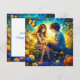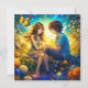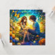 Personalized anime girl and boy on a romantic night Valentine's Day card. Pretty blue and gold flowers and water reflection.