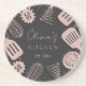 Introducing our Personalized Rose Gold Glitter Cooking Tools Paper Coaster. Featuring faux blush pink glitter, kitchen utensils. and customable texts on black background. Suitable for chef, home cook, and cooking enthusiasts.