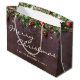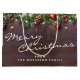 Custom merry christmas gift bag featuring a dark wooden background, festive christmas tree branches, red & gold tree decorations, pine cones, and string twinkle lights.