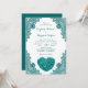 Complement your teal wedding party with these elegant personalized rustic teal wedding invitations featuring a hydrangea heart on a plain white background adorned with teal floral lace. Easily personalize these teal wedding cards with your wedding details. For matching items, please contact us via Zazzle chat.