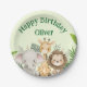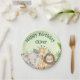 Celebrate your little explorer's special day with these adorable personalized safari-themed paper plates! Featuring a sweet watercolor illustration of a baby elephant, giraffe, and lion cub set against a leafy green background. Customize the "Happy Birthday" text with your child's name.