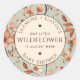 Add a whimsical and personal touch to your baby shower favours with this Personalized Sage Green Wildflower Baby Shower Classic Round Sticker. Perfect for a little wildflower girl baby shower, this sticker features a beautiful watercolor design of wildflowers in warm fall colours, including terracotta, burnt orange, and beige. The floral botanical greenery and sage green hues create a boho rustic modern aesthetic, perfectly complementing a neutral autumn wildflower theme.