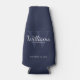 This bottle cooler features personalized groomsman's name in white classic script font style with wedding details in white classic serif font style and monogram in light navy blue classic serif font style as background, on navy blue background.