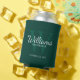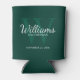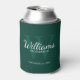 This can cooler features personalized groomsman's name in white classic script font style with wedding details in white classic serif font style and monogram in light emerald green classic serif font style as background, on emerald green background.