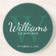 This coaster features personalized groomsman's name in white classic script font style with wedding details in white classic serif font style and monogram in light emerald green classic serif font style as background, on emerald green background.