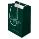 This gift bag features personalized groomsman's name in white classic script font style with wedding details in white classic serif font style and monogram in light emerald green classic serif font style as background, on emerald green background.