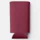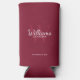 This can cooler features personalized groomsman's name in white classic script font style with wedding details in white classic serif font style and monogram in light burgundy red classic serif font style as background, on burgundy red background.