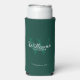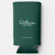 This can cooler features personalized groomsman's name in white classic script font style with wedding details in white classic serif font style and monogram in light emerald green classic serif font style as background, on emerald green background.