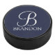 features personalized monogram in white classic script font style and name in white classic serif font style on navy blue background.