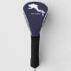 Personalized scuba diver gold head cover. Scuba diver with a text field at bottom centre. White on a navy blue background.