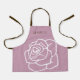 The product design features a simple large rose illustration in retro pink and white. This elegant botanic design makes a modern and unique apron with personalized text for kids.