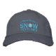 A Personalized Snow Embroidered Snowflake on Baby Blue embroidery. Easily edit the two text fields you see on this product page with your name or any text you like. This embroidered baseball cap is a great last minute gift for yourself or for someone special on your Winter Season list.