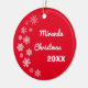Snowflakes accent the side of this ornament with fully customizable text to the right. Change the red background shown to any colour you prefer! The font style and size can also be changed. If there is room to fit it you can say it. A few ideas: a couple's first Christmas, a family group, etc. The back of the ornament is blank for you to personalize further if desired.