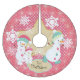 Three snowmen of various sizes with pink and blue winter hats, one wearing ice skates, a pink background with white polka dots and snowflakes of white with a banner you can easily personalize with your family name on a holiday tree skirt you're sure to love for years to come!