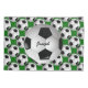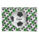 A football soccer ball design which is fully customizable with your own name or text. The background features a pattern of soccer balls on a football pitch green. Ideal for any soccer player, football coach or soccer fan.
