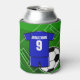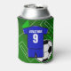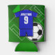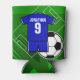 A stylish and modern sports design for any football or soccer fan featuring a soccer jersey with customizable text for the name and number of the soccer player, football fan or soccer coacht. It also features a modern green background representing grass on a soccer field and a soccer ball.