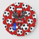 Treat the future soccer star in your life to one of these personalized monogram soccer Wall clocks. Featuring the Letter A with a template for the name to be added . Hanging from the letter A is a pair of soccer cleats, with a initialled water bottle and soccer ball either side. Background feature matching red as in the Initial and black and white soccer balls.