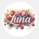Add a sweet and personal touch to gifts, party favours, or packaging with this round sticker featuring the name Luna in elegant 3D script. Surrounded by juicy strawberries, blueberries, raspberries, and soft watercolor florals, this design brings charm and whimsy to any occasion.