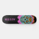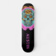 A bold in your face edgy day of the dead skateboard with painted sugar skull in orange, turquoise and hot pink, on a chalkboard background with a quirky font.