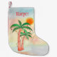 It is decorated with watercolor palm trees decorated like Christmas trees on a watercolor background with an orange sun.