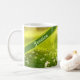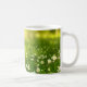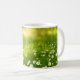 A cute mug that is great for your kids. This design features a green, grassy flower field in the summer. There is a green stripe going across the mug, and in the stripe is mint green letters that are personalized for your name.