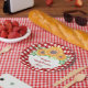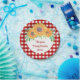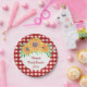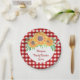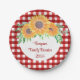 These floral family reunion paper plates will look great on your party table. They are decorated with watercolor sunflowers and foliage on a red check background.