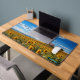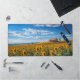 Bring the beauty of this sunflower field in full bloom into your workspace with this exquisite desk mat. Personalize it with a name printed on the lower right corner. This mat features a view of sunflower fields, barn houses and blue skies with a few cotton candy clouds with a high-quality print from a high definition graphic. It provides a smooth and comfortable surface for your work for your laptop, keyboard and mouse. It can also transform your workbench with a stylish and elegant touch. Perfectly suited for all creators, artists, writers and anyone inspired.