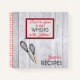 This fun rustic recipe notebook has red and black typography that says "Don't be afraid to take whisks in the Kitchen", bordered in a red and black trim. There are a pair of whisks at the bottom against a rustic, faded wood background. The lower right corner says Recipes and you personalize it right above that with your name.