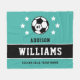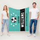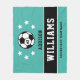 Personalized soccer themed fleece blanket for soccer players when they're not scoring goals on the field, and for their parents to support their kids and stay warm at chilly games! Makes a unique team gift for travel tournaments. Design features a soccer ball customized with the player's uniform number, custom text for the player's first and last name, and modern text for the soccer club team name. Stylish and modern design features sporty varsity jersey lettering and simple horizontal stripes with star accents. The colour scheme of aqua / teal blue, black, and white can be modified to coordinate with your team colours.