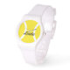 Personalized tennis ball watches with custom name. Sporty pink or white bands. Cute gift idea for tennis lovers.
