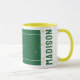 Creative tennis mug featuring tennis balls on green tennis court. To personalize edit text to add name of your favourite tennis player, coach or sports lover.