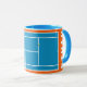 Creative tennis player gift mug featuring tennis balls on blue and orange tennis court. To personalize edit text to add his or her name.