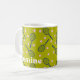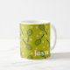 This mug has a pattern of dark blue tennis rackets and pale pink tennis balls against a yellow-green background.