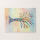 This unique jigsaw puzzle is decorated with a colourful mosaic tree on a watercolor background.