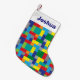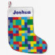 A pattern of toy bricks in a rainbow of colours - red, orange, yellow, blue, green, red and grey. Personalize this Christmas holiday stocking with a boy's name.
