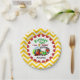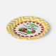 Train theme 3rd birthday paper plates features a locomotive, cars, and caboose on an oval train track with steam with text that reads Choo Choo! A bright yellow and white chevron stripe border edge with red circular trim, green, red, and yellow text that reads Birthday Fun I am 3 Today, and an area you can add the birthday child's name before ordering makes these train theme paper plates a great fit for that train theme third birthday party!