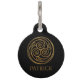 Dramatic black and gold intricate triple Celtic knot swirl mandala. Eternal spirals and trinity knots in gold on a black background. Personalized with your pet's name and your phone number, or give as a gift.