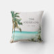 Bring tropical charm to your space with this personalized throw pillow! Featuring watercolor palm trees, a blue beach scene, and coastal vibes for beach house decor.