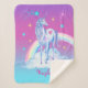 This personalized Sherpa blanket shows a mythical, majestic pink, purple, and blue unicorn standing on puffy white clouds in a unicorn cotton candy sky with a rainbow beaming in from the side. There are shooting stars in teal blue and pink, along with yellow and aqua blue stars in the background. Add your name or other text along the bottom.