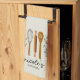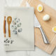 Personalized kitchen utensils towel designed for durability, style, and comfort. This cooking gift for anyone features styled green leaves, whisk, spoon, and baking rolling pin. All elements can be personalized with your own text, name, etc., including the pale eggshell background color of the towel can be changed to whatever color you prefer or remove it entirely.