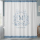 Bring timeless sophistication to your bathroom with this elegant vintage blue monogram shower curtain. Featuring a refined vintage-style crest framed by delicate floral detailing, this design showcases a classic initial and family name in soft, powder blue tones against a crisp white background. The subtle border accents add a tailored, heirloom-inspired finish that feels both graceful and serene. Perfect for traditional, French country, coastal, or classic interiors, this shower curtain transforms your bathroom into a calm, curated retreat while adding a personal touch through customization.