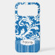 Trendy Victorian Damask Personalized with name or one word quote such as Believe, Appreciate, Dream, Courage, Encourage, Kindness, Humility, Positivity, ect. iPhone Cases. Stylish elegant Floral pattern, blue and white Floral pattern, unique rococo baroque floral damask, unique swirl vintage floral pattern, boho bohemian chic floral, retro antique romantic floral, gen z rococo chic floral, victorian heritage revival botanical, Blue stripe pattern, elegant blue and white damask