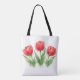 Elegant watercolor illustration of red tulips with soft green leaves, inspired by nature and floral beauty. A delicate personalized name adds a unique and meaningful touch, making this tote bag perfect for everyday use or as a thoughtful gift.