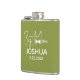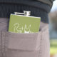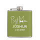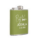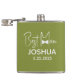 Personalized Wedding flask best man gift that can be personalized with the best man's name as well as date of wedding. The green flask has an elegant, modern script design with a bow tie graphic. A great gift for groom to give his best man.