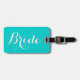 Personalized wedding travel luggage tag for bride. Elegant turquoise blue and white text design. Cute custom gift idea for newly weds on honeymoon.